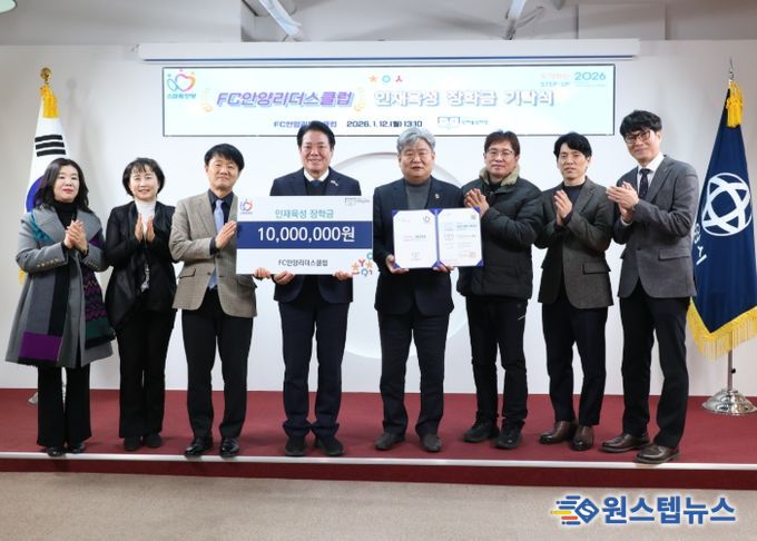 원스텝뉴스 이병희 기자 | 안양시 인재육성재단은 지난 12일 안양시 기반의 시민 참여형 후원 조직인 ‘FC안양리더스클럽(회장 김인환)’으로부터 미래 인재 양성 장학금 1,000만 원을 전달받았다고 13일 밝혔다.