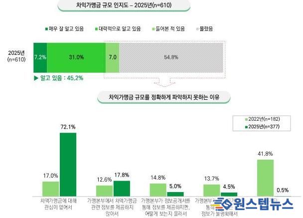 가맹본부의 53%가 차액가맹금이 존재한다고 응답했으며, 평균 금액은 연간 224만 원으로 조사됐다. 가맹점주를 대상으로 한 조사에서 차액가맹금의 규모를 알고 있는 응답자는 45.2%에 불과했으며, 정확하게 파악하지 못하는 이유에 대해 차액가맹금에 대한 무관심이 72.1%로 가장 높게 나타났다.