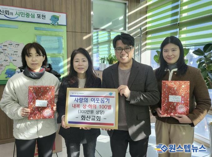 원스텝뉴스 이병희 기자 | 포천시 가산면 행정복지센터는 지난 13일, 관내에 소재한 화산교회가 지역 내 취약계층의 따뜻한 겨울나기를 지원하기 위해 내복 상·하의 세트 100벌을 기탁했다고 밝혔다.