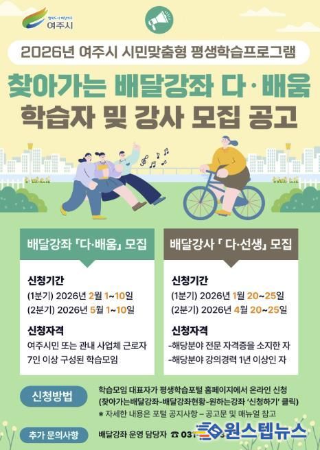 2026년 시민 맞춤형 ‘찾아가는 배달강좌’학습자·강사 신청은 여주시 평생학습포털을 통해 온라인으로 접수하며, 자세한 내용은 여주시 평생학습포털 공지사항을 참고하면 된다.