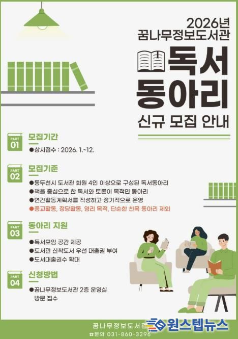 원스텝뉴스 이병희 기자 | 동두천시 도서문화사업소 꿈나무정보도서관은 시민들의 인문적 사고력 향상과 토론 문화 활성화를 위해 2026년 신규 독서동아리를 모집한다고 밝혔다.