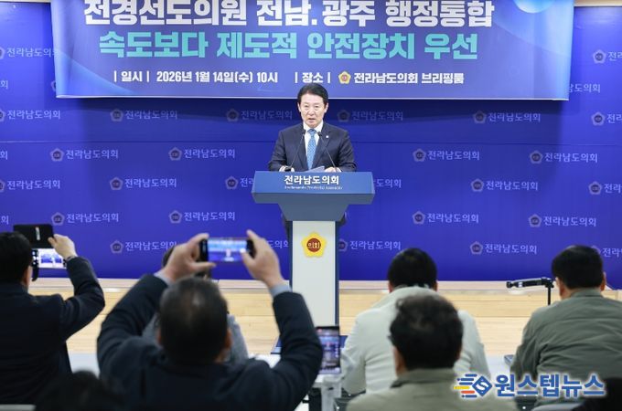 원스텝뉴스 이병희 기자 | 전라남도의회 전경선 의원(더불어민주당·목포5)은 14일, 전라남도의회 브리핑룸에서 기자회견을 열고, 전남-광주 행정통합과 관련해 “통합의 큰 방향과 대의에는 동의하며 적극 지지하지만, 속도전 통합이 아닌 제도적 안전장치가 우선돼야 한다”고 밝혔다.