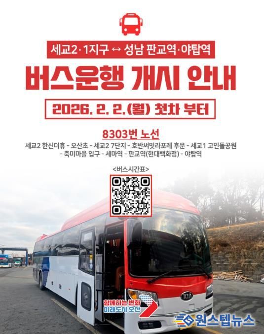 이번에 신설되는 8303번 버스는 하루 2대가 투입돼 총 8회 운행된다. 세교1·2지구를 비롯한 오산 주민들의 수도권 남부 이동 편의를 크게 높일 것으로 기대된다. 특히 성남 판교·야탑 방면 직행 노선에 대한 시민들의 지속적인 요구를 반영해 마련된 노선이라는 점에서 의미가 크다.