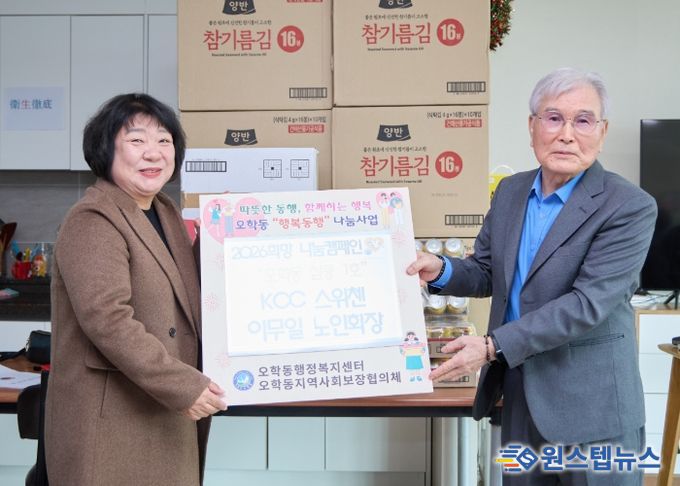 원스텝뉴스 이병희 기자 | 오학동 행정복지센터는 지난 12일, 천송5통(kcc스위첸) 이무일 노인회장이 2026년도 첫 기부로 지역 내 어려운 이웃을 위해 40만 원 상당의 현물(김, 전복죽, 식혜)을 기부했다고 밝혔다.