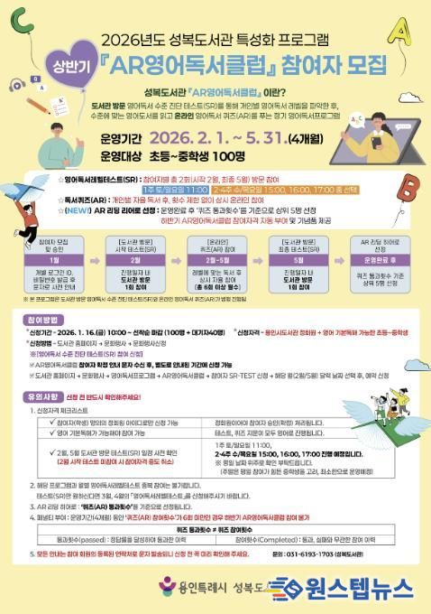 원스텝뉴스 이병희 기자 | 용인특례시 성복도서관은 오는 16일부터 2026년 ‘AR(Accelerated Reader)영어독서클럽’ 상반기 참여자 100명을 모집한다고 15일 밝혔다.