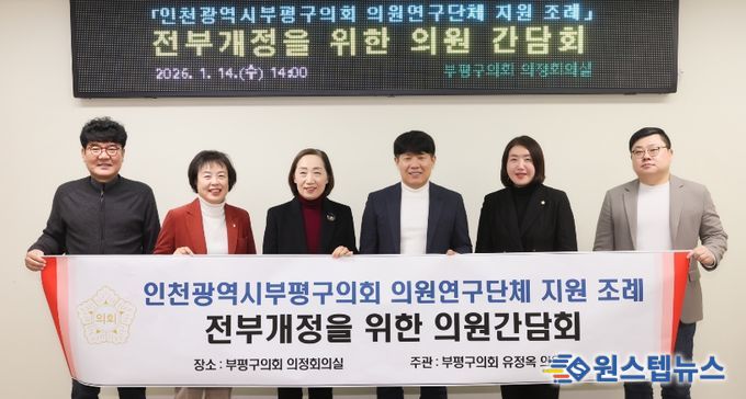 원스텝뉴스 이병희 기자 | 인천 부평구의회는 지난 1월 14일 부평구의회 의정회의실에서 유정옥 의원(국민의힘, 부평3, 산곡3·4, 십정1·2동) 주관으로 「인천광역시부평구의회 의원연구단체 지원 조례」의 전부개정을 위한 의원 간담회를 개최했다고 밝혔다.