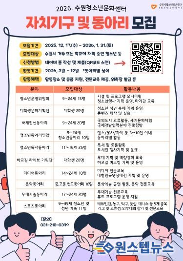 이번 모집은 1월 31일까지 진행되며, 수원시에 거주하거나 관내 학교에 재학 중인 청소년이라면 누구나 지원할 수 있다. 신청은 포스터 내 QR코드를 통한 네이버 폼 온라인 접수로 가능하다.