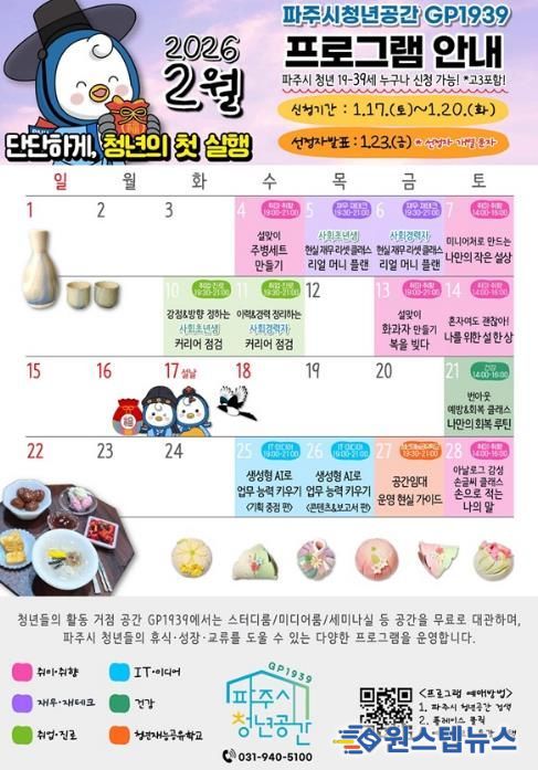 원스텝뉴스 이병희 기자 | 파주시청년공간 지피(GP)1939가 오는 2월 한 달간 청년을 위한 맞춤형 프로그램에 참여할 참여자를 모집한다.