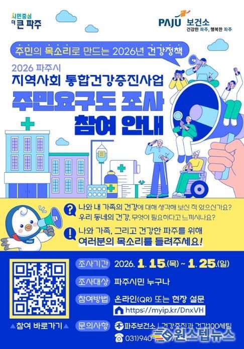 원스텝뉴스 이병희 기자 | 파주시는 시민의 건강한 삶을 지원하기 위해 '2026년 지역사회 통합건강증진사업’추진에 앞서 주민건강요구도 조사를 실시한다.