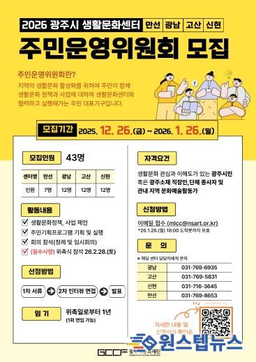 원스텝뉴스 천규영 기자 | (재)광주시문화재단은 광주시 생활문화센터(만선·광남·고산·신현)에서 2026년에 활동할 주민운영위원회 위원을 통합 공개 모집한다고 밝혔다.