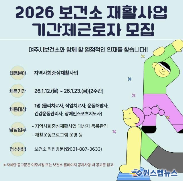 원스텝뉴스 이병희 기자 | 여주시보건소는 지역 내 등록장애인과 예비장애인들의 건강관리를 위한 지역사회중심재활사업 추진을 위해 1월 12일부터 1월 23일까지 2주간 기간제근로자 채용 공고를 실시한다.