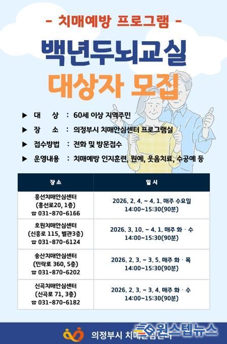 원스텝뉴스 이병희 기자 | 의정부시 보건소 치매안심센터는 치매 예방과 인지기능 유지‧향상을 위한 2026년 상반기 치매예방 프로그램 ‘백년두뇌교실 1기’를 운영한다.