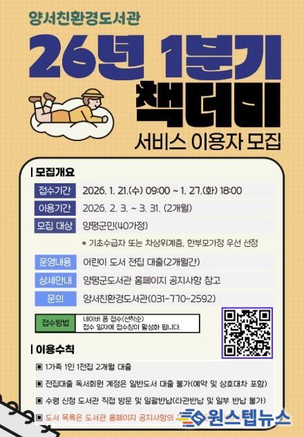 원스텝뉴스 이병희 기자 | 양평군은 오는 21일부터 27일까지 2026년 1분기 어린이 전집 대출 서비스인 ‘책더미’ 이용자를 모집한다고 밝혔다.