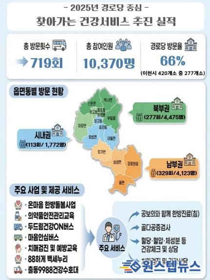 분석 결과, 2025년 한 해 동안 경로당 277개소를 총 719회 순회하여 10,370명의 어르신에게 한방진료, 골밀도 측정, 건강상담, 치매검진, 운동교실 등 다양한 건강관리서비스를 제공했다. 이는 이천시 전체 경로당의 66%(277개소)에 달하는 수치다.
