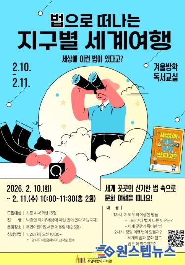 겨울방학 독서교실은 각 주제별로 2회씩 운영된다. ‘환경’을 주제로 한 초등 3~4학년 대상 프로그램은 1월 27일(화), 1월 28일(수) 오전 10시에 진행되며, ‘법’을 주제로 한 초등 4~6학년 대상 프로그램은 2월 10일(화), 2월 11일(수) 오전 10시에 진행된다.