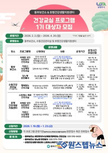 원스텝뉴스 이병희 기자 | 남양주시는 오는 1월 19일부터 23일까지 호평건강지원센터에서 ‘건강교실 프로그램’ 1기 참여자를 모집한다고 밝혔다.