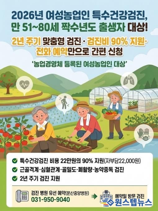 ‘여성농업인 특수건강검진 지원사업’은 농작업으로 인한 근골격계 질환과 만성질환을 조기에 예방하기 위해 여성농업인 맞춤형 건강검진을 2년 주기로 지원하는 사업으로 2025년도에는 251명이 검진을 지원받았으며, 2026년도에는 564명으로 지원 규모가 확대된다.