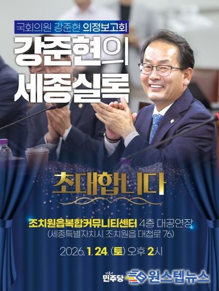 원스텝뉴스 이병희 기자 | 더불어민주당 강준현 국회의원(세종시을)이 2026년 1월 24일 오후 2시, 조치원복합커뮤니티센터 대공연장(조치원읍 대첩로 76)에서 의정보고회를 연다.