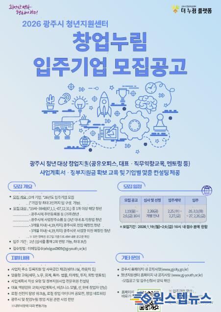 원스텝뉴스 이병희 기자 | 광주시는 지역 내 유망한 청년 창업가를 발굴하고 안정적인 창업 환경을 조성하기 위해 ‘2026년도 창업누림 신규 입주기업’을 공개 모집한다고 19일 밝혔다.