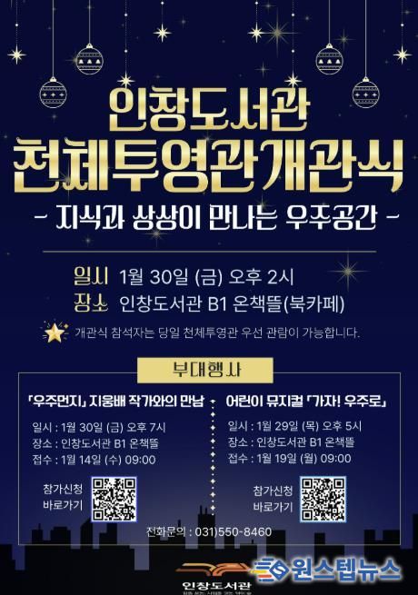 원스텝뉴스 이병희 기자 | 구리시는 오는 1월 30일 오후 2시 인창도서관 지하 북카페에서 주요 내빈이 참석한 가운데 4층 야외에 조성된 인창도서관 천체투영관 개관식을 개최한다고 밝혔다.