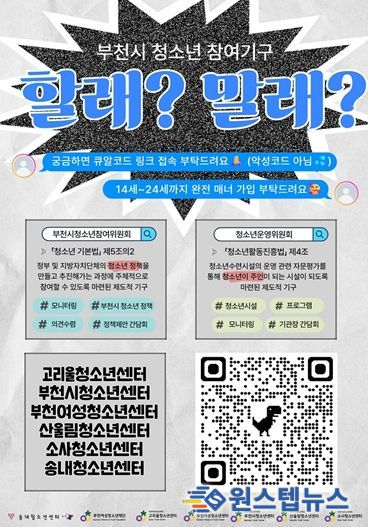 원스텝뉴스 이병희 기자 | 부천 지역 6개 청소년센터(고리울·부천시·산울림·소사·송내·부천여성청소년센터)가 연합하여 청소년들의 주도적인 성장을 지원할 ‘2026년 청소년 참여기구’ 신규 위원을 오는 2월 14일까지 모집한다.