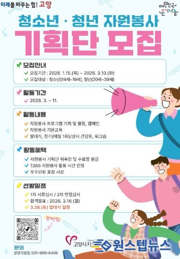 원스텝뉴스 이병희 기자 | 고양시자원봉사센터는 청소년과 청년이 직접 자원봉사 활동을 기획하고 실행하는‘2026년 청소년·청년 자원봉사 기획단’ 단원을 모집한다고 밝혔다.