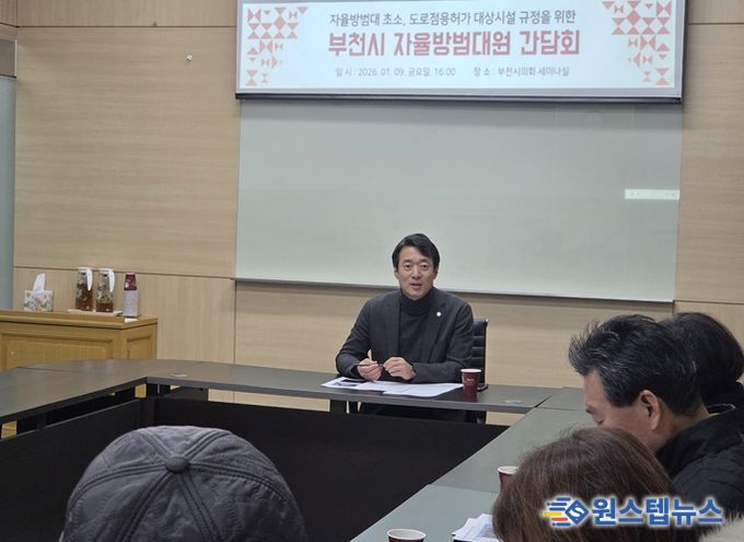원스텝뉴스 이병희 기자 | 부천시의회 정창곤 의원(국민의힘, 심곡본1동·심곡본동·송내1·2동)은 지난 9일 부천시의회 세미나실에서 ‘자율방범대 초소, 도로점용허가 대상시설 규정을 위한 부천시 자율방범대원 간담회’를 개최했다.
