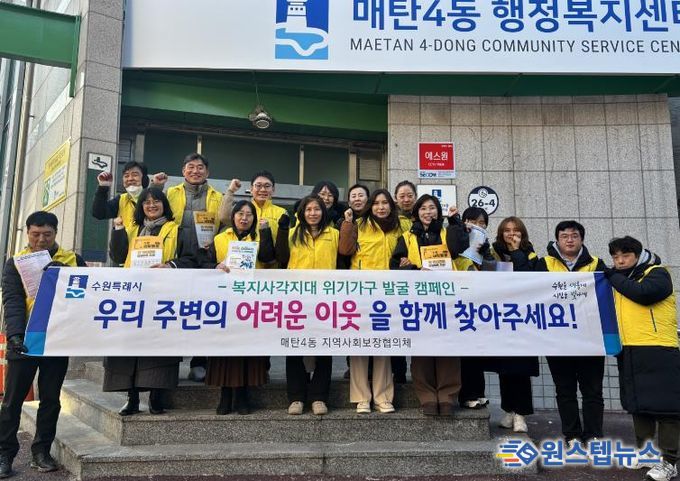 오미숙 매탄4동장은 “매탄4동 행정복지센터는 앞으로도 지속적인 위기가구 발굴 활동을 통해 동절기 복지 안전망 구축에 힘쓰겠다”며 “추운 날씨에도 캠페인에 적극 참여해 주신 지역사회보장협의체 위원님들께 감사드린다”고 밝혔다.