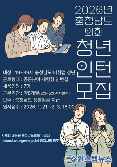 원스텝뉴스 이병희 기자 | 충남도의회는 사회진출을 준비하는 도내 청년들에게 의회 업무 참여 기회를 제공하고 청년들의 참신한 아이디어로 의정 발전을 도모하기 위해 1월 21일부터 2월 3일까지 함께 일할 청년인턴을 채용할 예정이라고 밝혔다.
