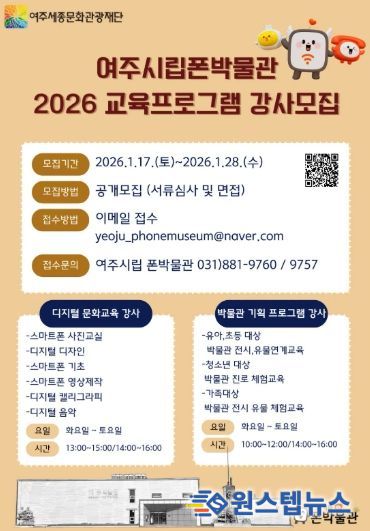 원스텝뉴스 천규영 기자 | 여주세종문화관광재단은 여주시립 폰박물관의 특성을 살린 디지털 문화교육 및 박물관 기획 교육 프로그램 운영을 위해 '2026 여주시립 폰박물관 교육 프로그램 강사'를 공개 모집한다.