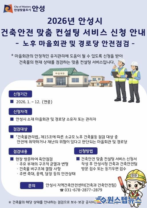 원스텝뉴스 이병희 기자 | 안성시는 올해 ‘건축안전 맞춤 컨설팅 서비스(노후 마을회관 및 경로당 안전점검)’를 시행한다고 밝혔다.