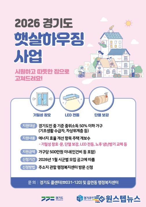 원스텝뉴스 이병희 기자 | 경기도가 난방비 및 전기료 등 주거비 부담을 덜어주기 위해 2026년 햇살하우징 사업을 추진한다.