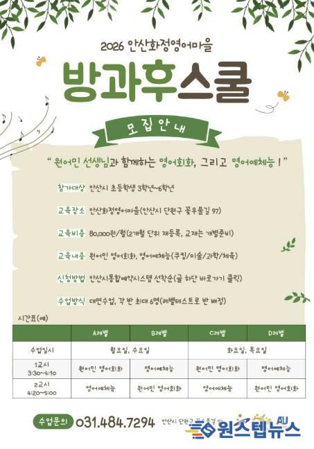 원스텝뉴스 이병희 기자 | 안산시가 설립하고 안산대학교가 운영하는 안산화정영어마을은 관내 초등학생을 대상으로 2026년 방과후 프로그램을 운영한다고 26일 밝혔다.