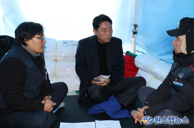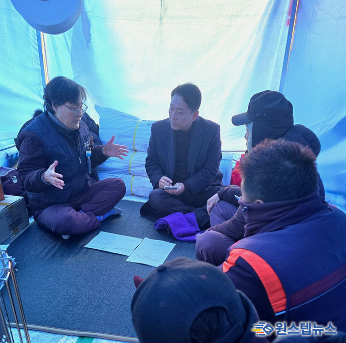 진석범 화성특례시장 출마예정자(전 청와대 선임행정관)가 23일 아침 화성시청 앞에서 복직을 요구하며 농성 중인 환경노동자들과 공공운수노조 관계자들을 방문했다.