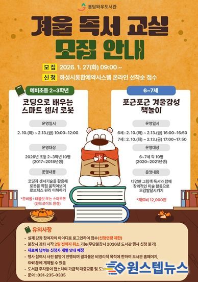원스텝뉴스 천규영 기자 | 화성시문화관광재단 봉담와우도서관은 겨울방학을 맞아 지역 아동과 유아를 대상으로 한 독서문화 프로그램인 ‘겨울 독서교실’을 2월 10일부터 13일까지 운영한다고 밝혔다.