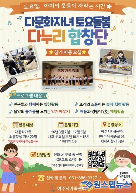 원스텝뉴스 이병희 기자 | 여주시가족센터는 여주시의 지원을 받아 다문화가족 자녀를 대상으로 운영한 토요돌봄 프로그램 ‘다누리 합창단’의 2025년도 운영을 성공적으로 마무리하고, 2026년도 프로그램 운영을 재개하며 참여 아동을 모집한다.