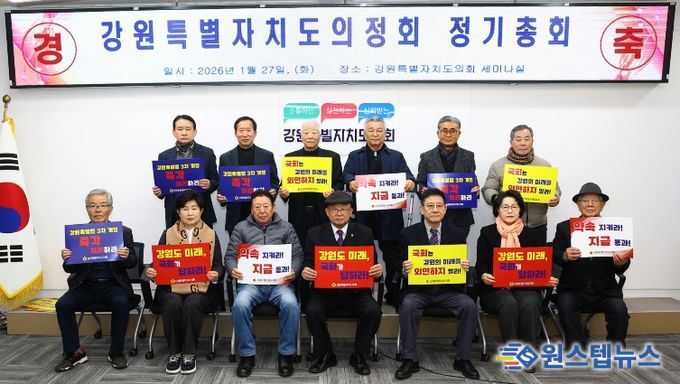 원스텝뉴스 이병희 기자 | 강원특별자치도의정회는 1월 27일 11시.도의회 세미나실에서 2026년도 정기총회를 개최했다. 정기총회를 진행한 가운데 의정회원들이 강원특별법 3차 개정안 심사와 통과 촉구 결의문 낭독과 함께 피켓 퍼포먼즈로 강원특별자치도의 제도적 기반 강화를 위한 의지를 한데 모았다.