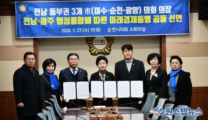 원스텝뉴스 이병희 기자 | 여수시의회는 27일 오후 3시 순천시의회 의장실에서 강형구 순천시의회 의장, 최대원 광양시의회 의장과 함께 '전남·광주 행정통합에 따른 전남동부권(여수·순천·광양) 미래경제동맹 공동선언문'을 발표했다.