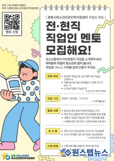 원스텝뉴스 이병희 기자 | 광명시청소년재단 청소년진로진학지원센터는 관내 청소년들에게 현실적인 직업 정보와 체계적인 진로 설계 기회를 제공하기 위해 ‘2026년 직업인 멘토’를 신규 모집한다고 밝혔다.