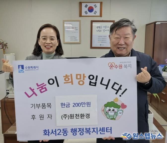 원스텝뉴스 이병희 기자 | 수원시 팔달구 화서2동 행정복지센터는 최근 관내 폐기물 수거업체 원천환경이 어려운 이웃을 위해 사용해 달라며 이웃돕기 성금 200만 원을 기탁했다고 밝혔다.