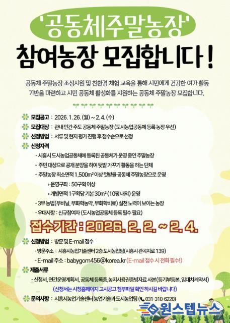 원스텝뉴스 이병희 기자 | 시흥시는 도시민의 농업 체험 기회를 확대하고 지역공동체 활성화를 도모하기 위해 ‘2026년 공동체 주말농장 조성 및 운영 지원 사업’을 운영하는 가운데, 민간 주도 공동체 주말농장 5곳을 오는 2월 2일부터 4일까지 모집한다.