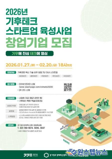 원스텝뉴스 이병희 기자 | 경기도와 경기창조경제혁신센터가 기후테크 스타트업을 글로벌 유니콘기업으로 육성하기 위해 2월 20일까지 ‘기후테크 스타트업 육성 3기’ 34개 사를 모집한다.