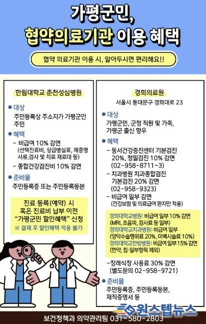 가평군은 대형 의료기관 이용 부담을 줄이기 위한 협약 의료서비스도 시행하고 있다. 한림대학교 춘천성심병원, 경희의료원 2곳과 협약을 맺어 군민이 해당 병원을 이용할 경우 비급여 진료비 등을 감면받도록 했다. 다만 협약 의료기관 감면 혜택은 예약 단계 또는 진료비 납부 이전에 신청한 경우에만 적용된다. 이미 결제가 완료된 건에 대해서는 소급 적용이 되지 않아 주의가 필요하다. 협약 의료기관을 이용해 감면 혜택을 받은 군민이 연간 4,000여 명에 달할 정도로 좋은 반응을 얻고 있다.
