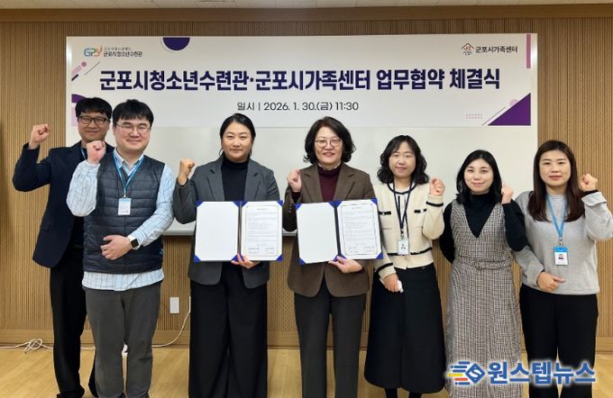 원스텝뉴스 이병희 기자 | (재)군포시청소년재단 군포시청소년수련관(관장 박윤정)과 군포시가족센터(센터장 박성희)는 1월 30일, 군포시청소년수련관 3층 어학실에서 다문화가정을 포함한 청소년의 건강한 성장과 전통문화 가치 확산을 위한 업무협약(MOU)을 체결했다.