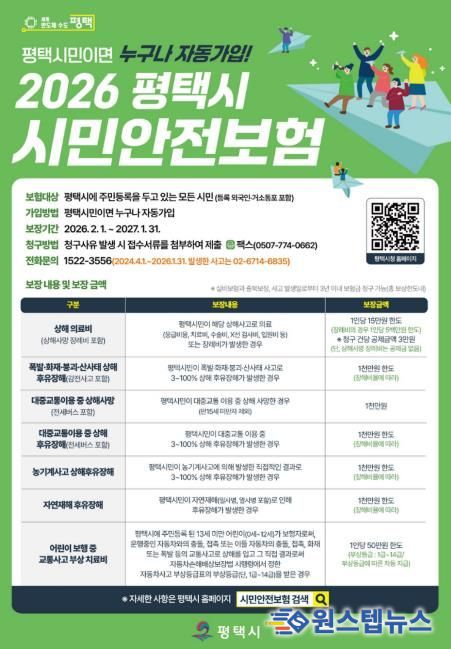 원스텝뉴스 이병희 기자 | 평택시는 일상생활에서 예기치 못한 재난·사고 피해를 지원하기 위한 '2026년 평택시 시민안전보험'을 갱신하고, 시민 누구나 혜택을 받을 수 있도록 홍보에 나섰다고 밝혔다.