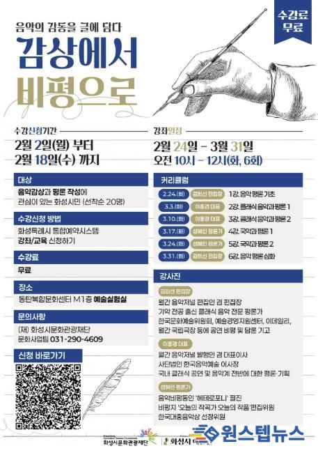 원스텝뉴스 천규영 기자 | (재)화성시문화관광재단은 음악 감상과 글쓰기에 관심 있는 시민을 대상으로 음악평론 강좌 '감상에서 비평으로'를 운영한다.