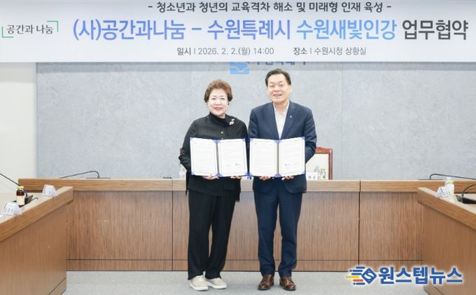 수원시와 (사)공간과나눔은 2일 시청 상황실에서 수원새빛인강 업무협약을 체결하고, 협력을 약속했다.