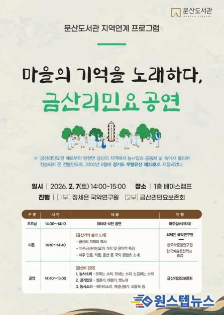원스텝뉴스 천규영 기자 | 파주시 문산도서관은 오는 7일 경기도 무형유산 제33호 ‘파주금산리민요’를 주제로 강연과 공연이 함께하는 ‘렉처 콘서트’를 개최한다.