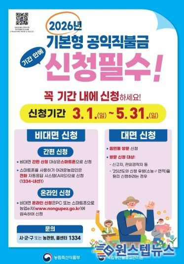 원스텝뉴스 이병희 기자 | 양주시가 농업·농촌의 공익기능 증진과 농업인의 소득 안정을 위해 ‘2026년 기본형 공익직접지불금’을 오는 3월 1일부터 5월 31일까지 신청받는다.