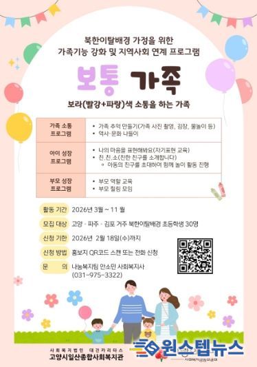 원스텝뉴스 이병희 기자 | 고양시일산종합사회복지관이 북한이탈배경 가정의 가족기능 강화 및 지역사회 통합 프로그램 ‘보통 가족’의 참여자를 이달 18일까지 모집한다.